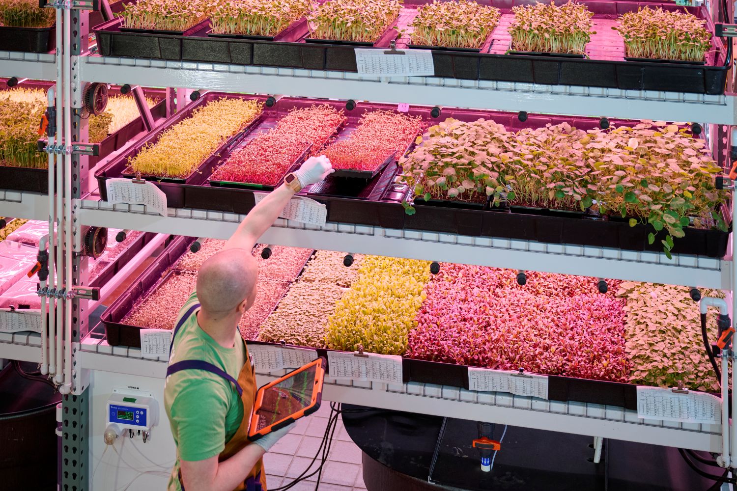 We stack our microgreens and flowers like an apartment complex, meaning we grow more in less space and can operate in urban areas, closer to you.